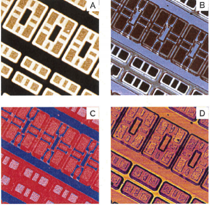 图1 静态随机存储 (SRAM) 样品。所有通道同时获得了29µm扫描区域:a:形貌;b:dC/dV振幅(与掺杂浓度成反比);c:dC/dV相位(蓝色表示p型掺杂,红色表示n型掺杂);d:电容(与掺杂浓度有线性关系);