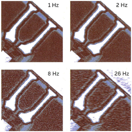 不同扫描速度比较的SRAM样品。微分电容(dC/dV)振幅图像给出了相同的5µm区域内扫描率从1 Hz到26 Hz的结果。以快速度数据质量几乎保持不变,但是图像只需要1秒就可以获得,而传统的SCM需要5-10分钟。