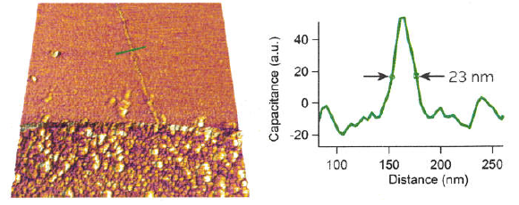 牛津仪器Asylum Research全新设计的SCM模式显示出更高的灵敏度,因此可以获得更高的分辨率的图像。以前被认为使用SCM模式由于信号弱难以图像的样品,现在可以常规地获得图像。右侧图中,采用全新的SCM模式对单壁碳纳米管(CNT)进行成像,横向分辨率约为25 nm。