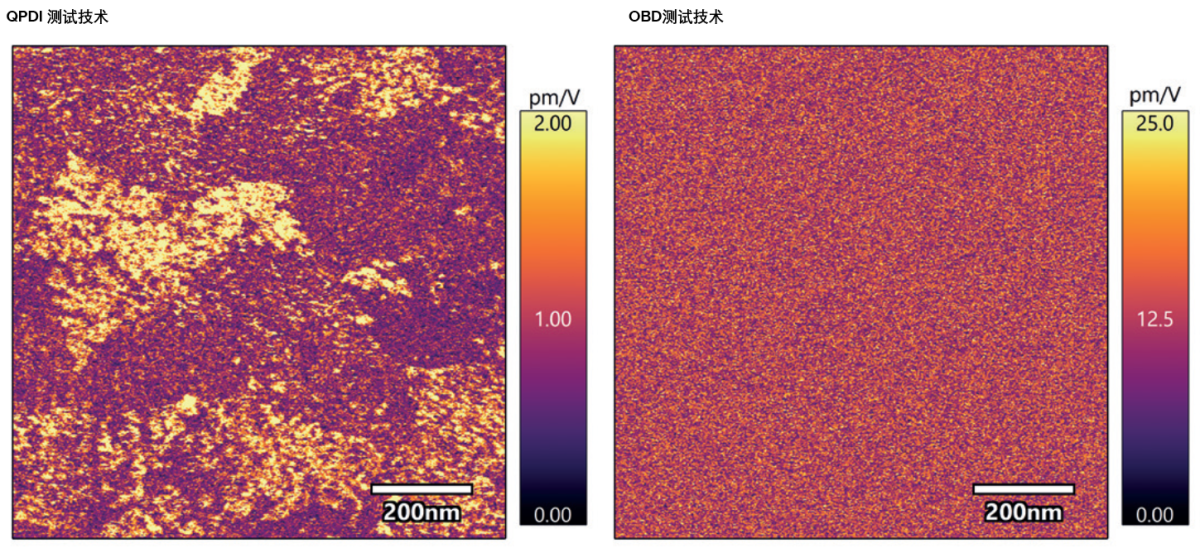 HfO2表现出超低的压电响应,这使得用PFM测量具有挑战性。如左图所示,干涉仪测试的灵敏度使得压电畴的分辨率清晰可见。右图是在带有OBD的传统AFM上,压电响应信号完全被本底噪声所掩盖。(样本由德国NamLab提供)。