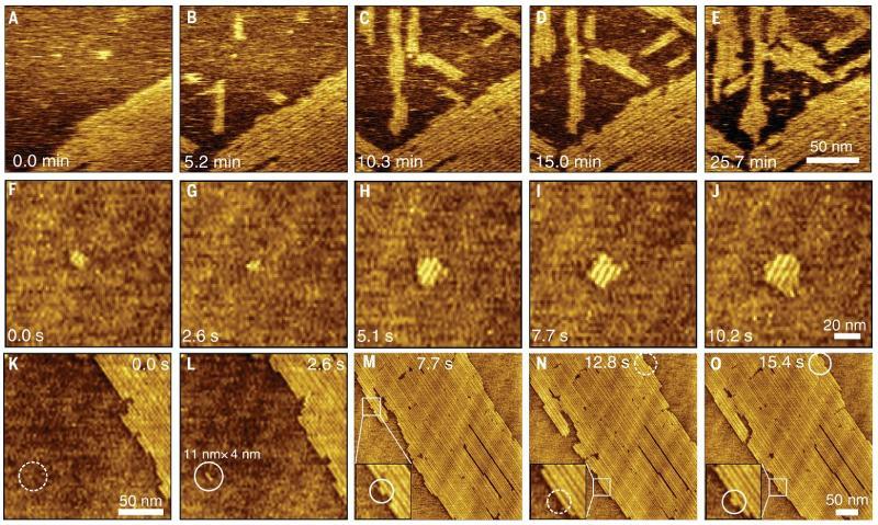 图2 :原位AFM图像显示肽附着在表面并直接生长程有序结构晶体,是一个逐步的过程,每次增长一个单元。(F-J)晶核小岛的形成和发展;单排成核[(K)和(L)],并列入现有行相邻的新行[(M)到(O)]。