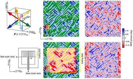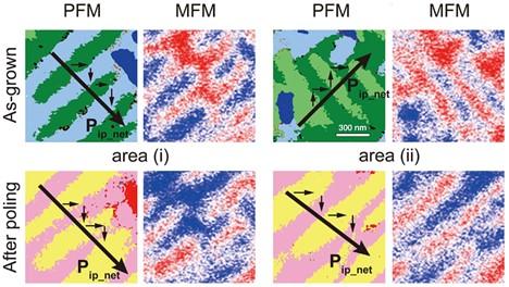 日本的研究组制备了BFCO钴铁酸铋薄膜(部分铁原子被钴原子置换的铁酸铋),能够在室温中自发形成面外的磁畴结构。通过纳米尺度的磁学表征和机电耦合表征,研究者证实了材料的磁畴能够被电场翻转。