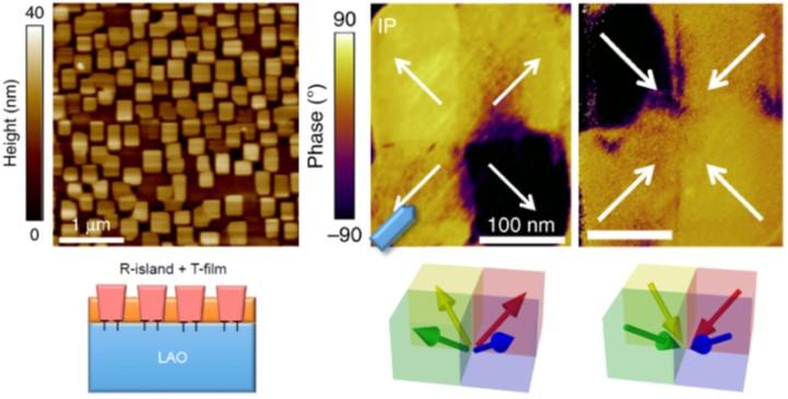 来自中国清华大学以及其它几所著名高校的研究人员通过探究铁酸铋(BFO)材料的受控极化翻转行为对这一热点问题进行了深入研究。其研究样品为自组装的斜方变形BFO纳米岛(R相)嵌入在铝酸镧(LAO)上的四方变形BFO薄膜(T相)中。