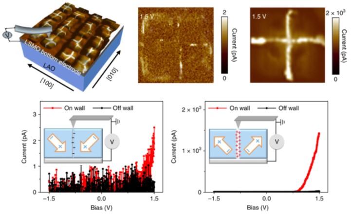 铁电材料中的导电畴壁(DW)相当于一种特定路径的电荷传导通路,可以用于实现超低功耗的非易失存储器。然而,在极化翻转的过程中对导电畴壁的具体位置以及导电性的精准操控仍然具有很强的挑战性。